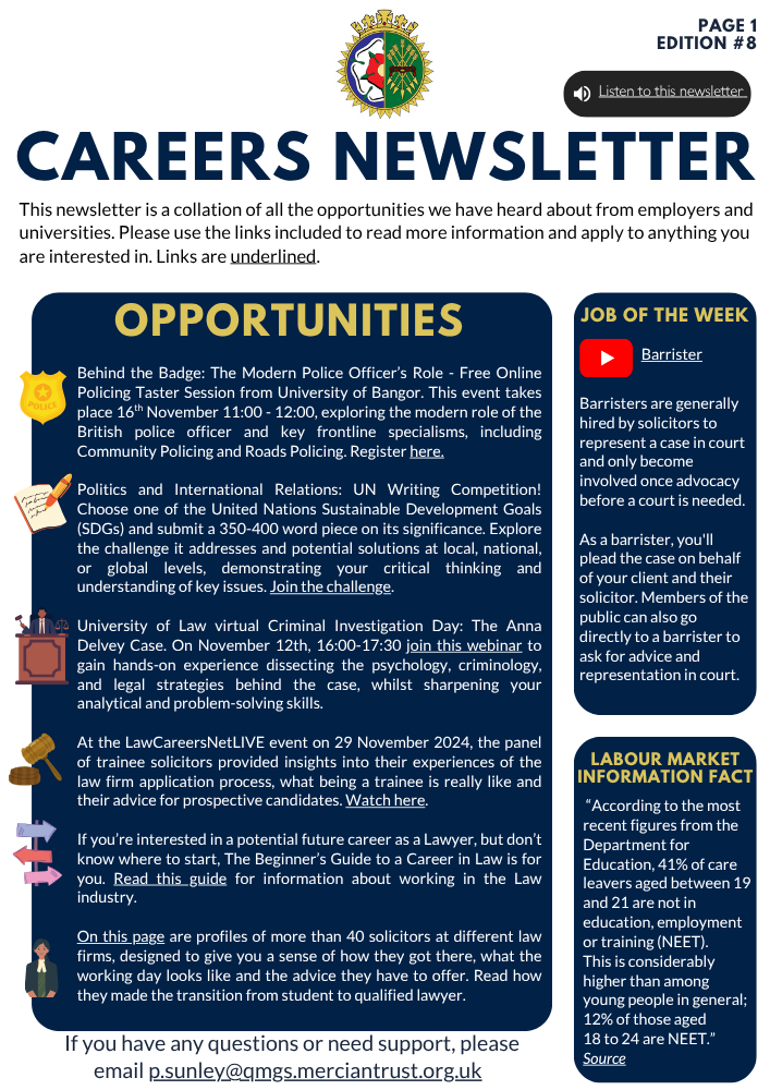 We offer a range of activities across all year groups which you could be a part of such as career talks, mock interviews, skills workshops – If you think you may be able to contribute to the careers programme please contact Mr Sunley the CEIAG Coordinator at ceiag@qmgs.merciantrust.org.uk